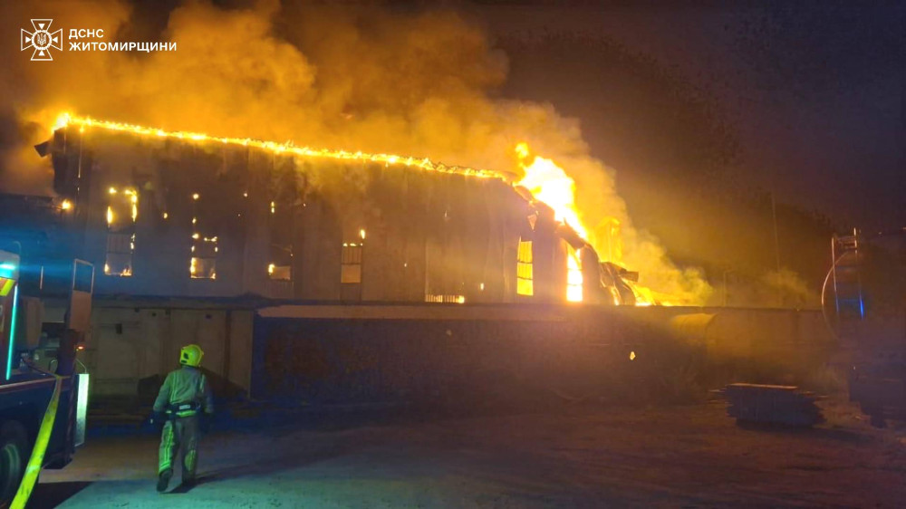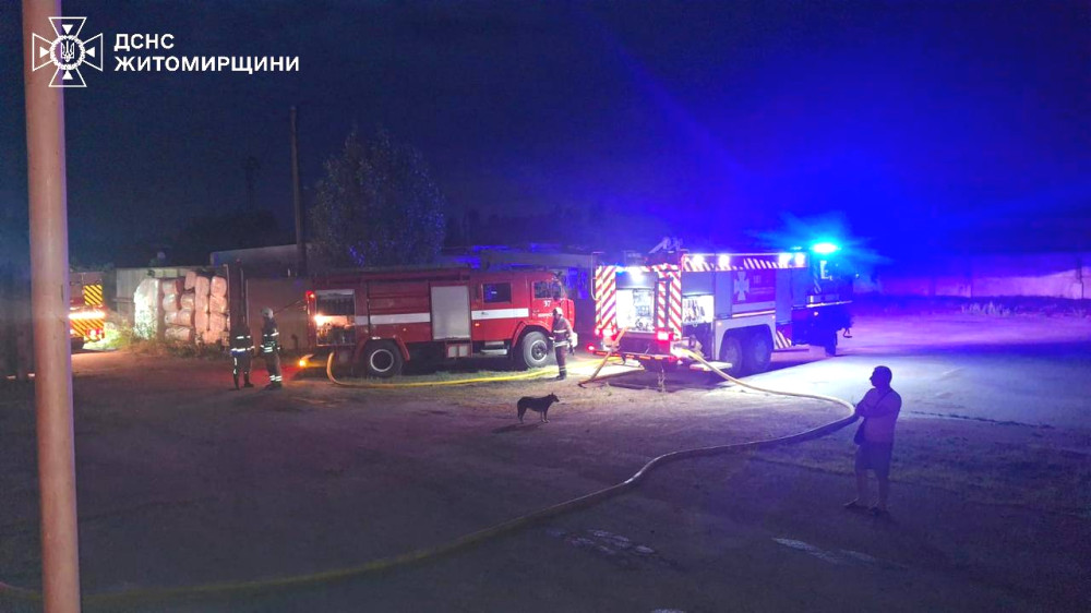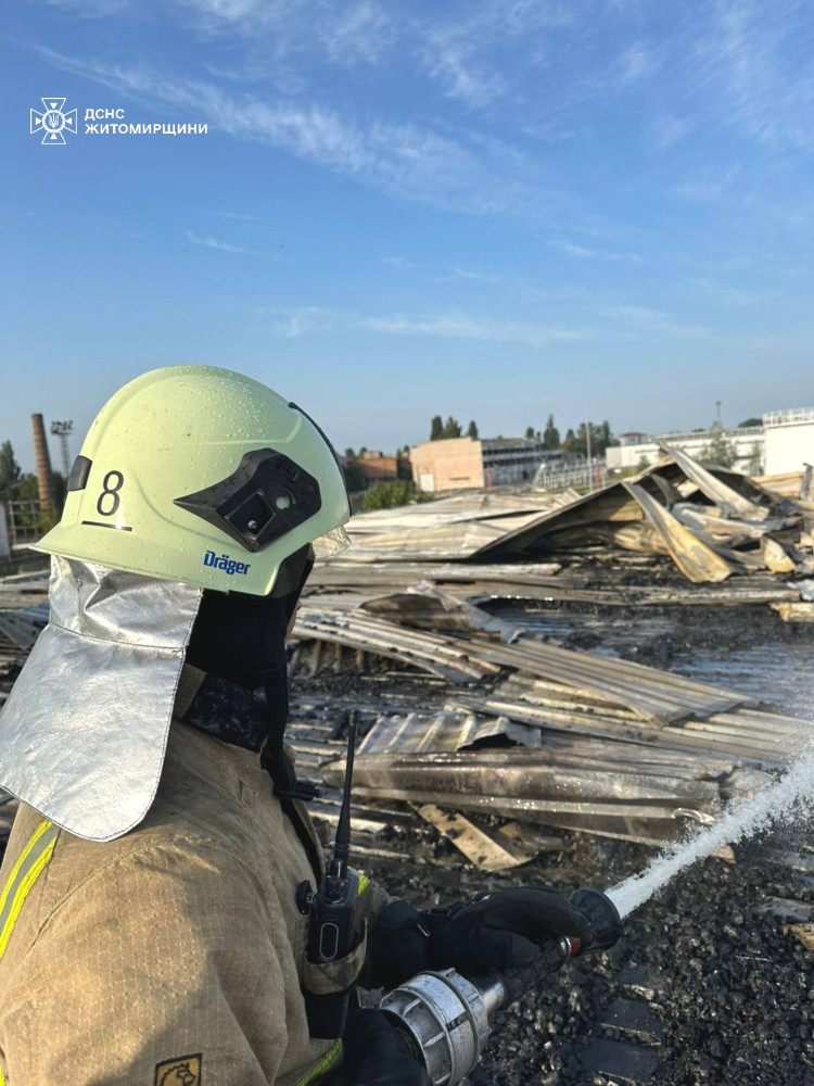В нічний час у Коростені, Житомирської області, вогнеборці успішно ліквідували вогонь у металевій будівлі складу, що не експлуатується. Пожежа охопила дерев'яні конструкції даху і стін, сендвіч-панелі та інше майно всередині. Загальна площа пожежі становила близько 500 квадратних метрів. Існувала небезпека розповсюдження полум'я на сусідній склад. Гасіння ускладнювалося сильним димом та високою температурою. Рятувальники працювали на даху будівлі, висота якого досягала 10 метрів. Для ліквідації пожежі було залучено додаткові сили та техніку.