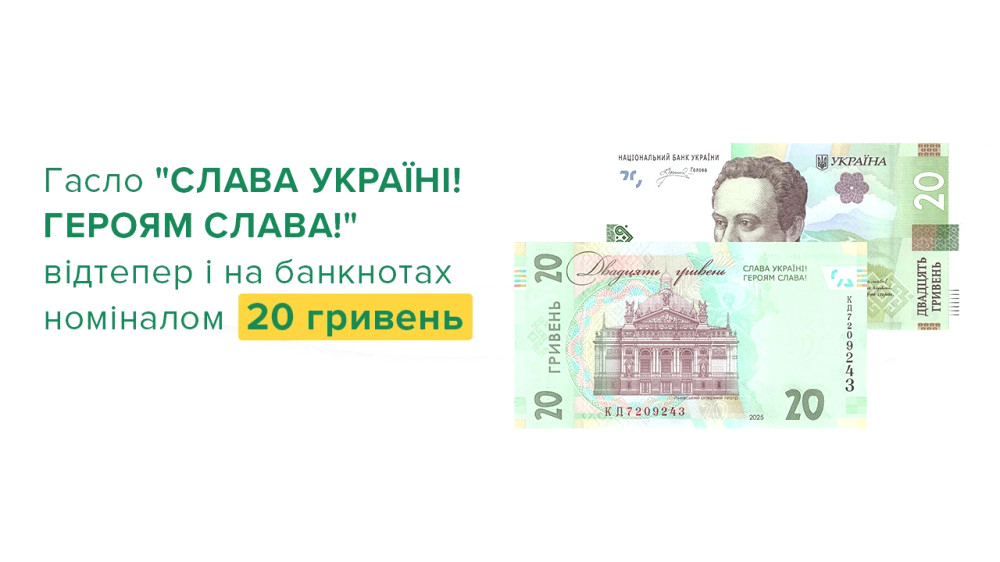 З 21 серпня в обіг вводяться нові модифіковані банкноти номіналом 20 гривень. На зворотному боці в правому верхньому куті буде розміщено гасло "Слава Україні! Героям слава!"