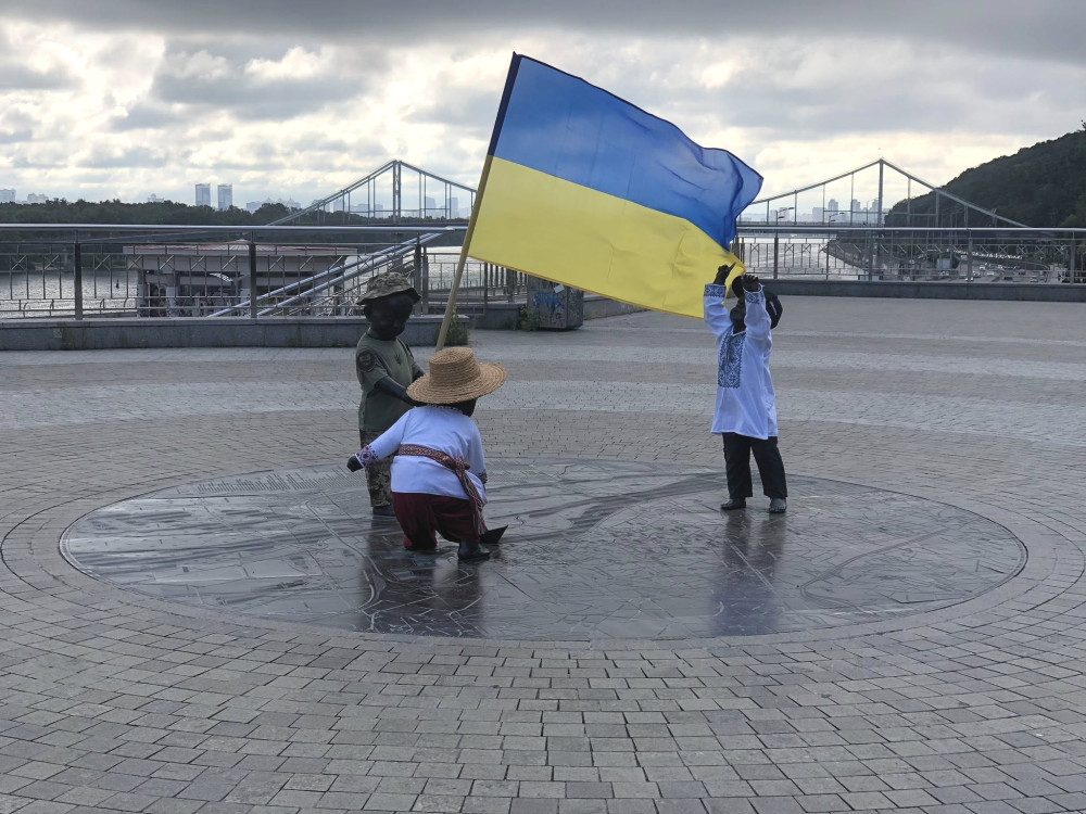 У столиці України, Києві, в честь Дня Державного прапора та Дня Незалежності, скульптури малюків-засновників міста, які знаходяться на Поштовій площі, отримали нові вбрання.