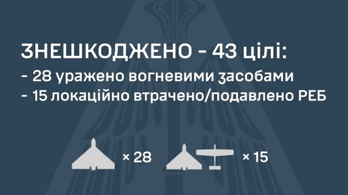 За даними ЗСУ, станом на 09:00 вдалось знищити 43 ворожі безпілотники, з яких 28 були збиті, а 15 - нейтралізовані засобами електронної боротьби.