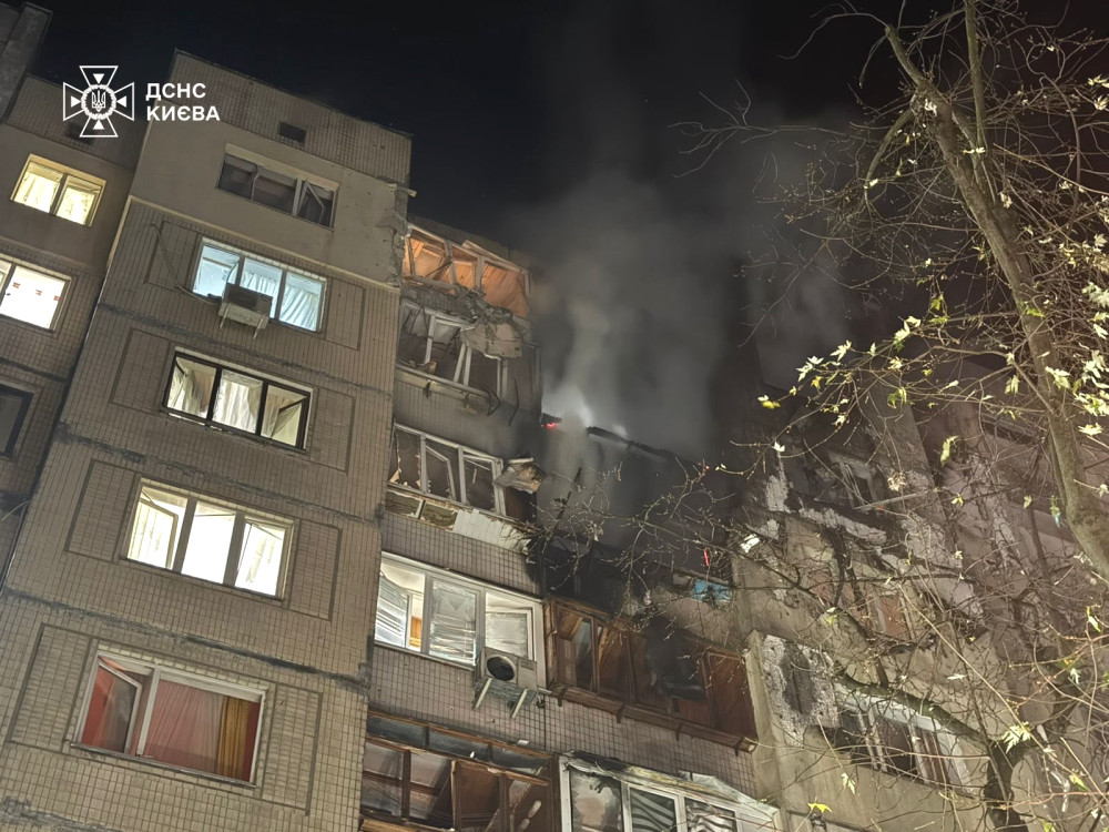 У Дніпровському районі уламки дрону потрапили в п'ятиповерхівку, викликавши руйнування на нижніх поверхах і пожежу в двох квартирах. Усього рятувальники врятували понад 40 мешканців з постраждалих будинків.